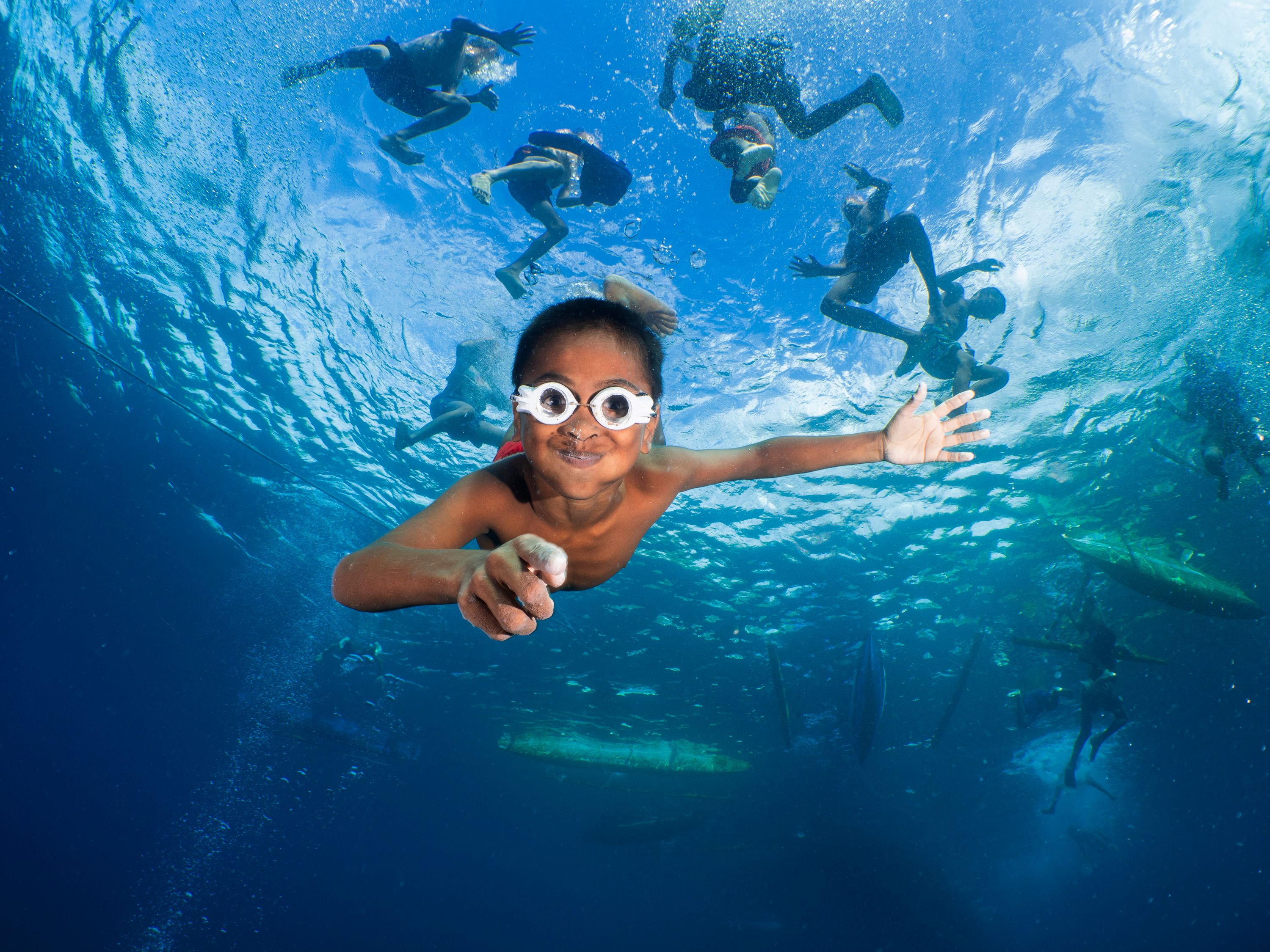 Off Alor, local children play in the water with their homemade wooden goggles held together by fishing line. Indonesia.