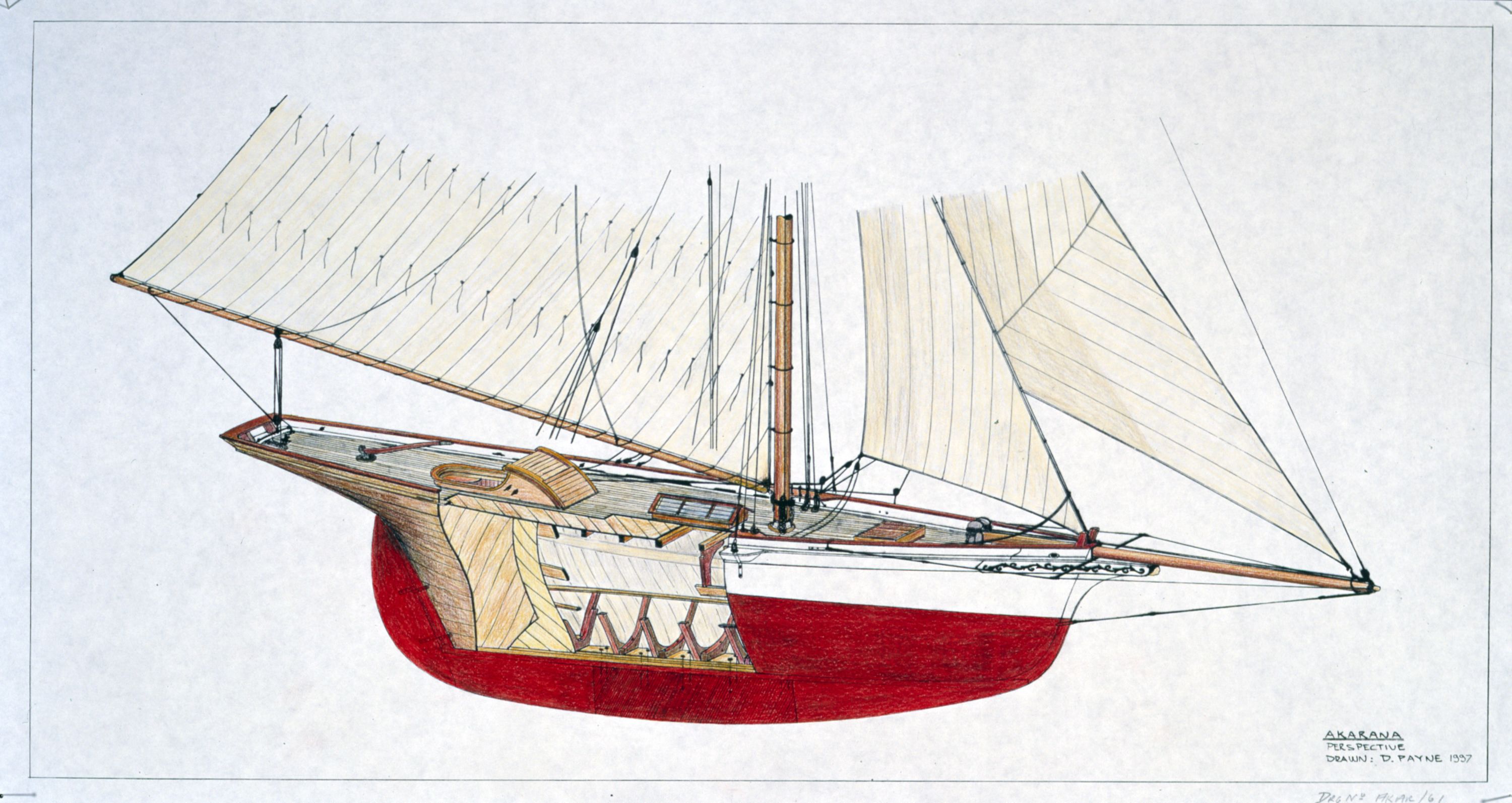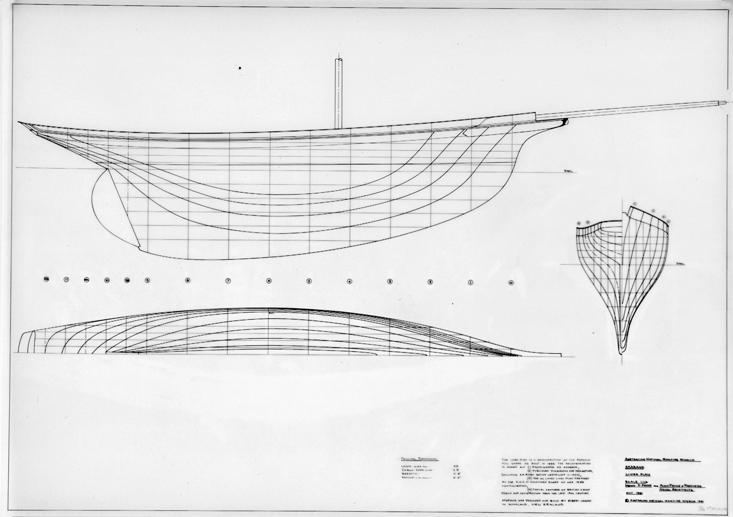The yacht was taken from the water in 1997-98 in a year-long project to return it as close as possible to its original design. Intensive research into designer-builder Robert Logan's work and 19th-century yacht-building practices, plus records and oral histories of Akarana's century in Australia, was combined with analysis as the modified lead keel, rudder and other structures were removed. All provided clues about the original configuration.
